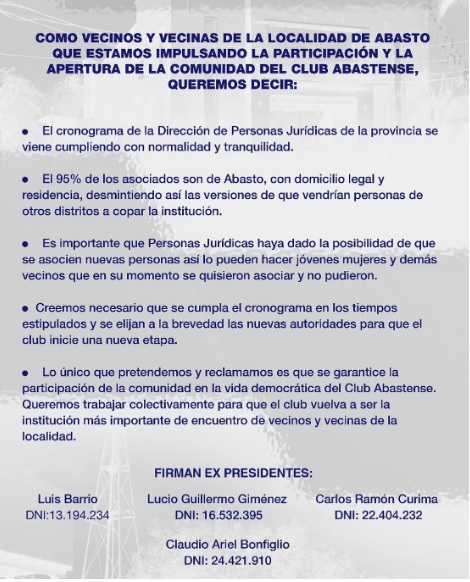 Hace más de treinta años que no se realizan elecciones. En tal sentido, finaliza el comunicado enviado: «Lo único que pretendemos y reclamamos es que se garantice la participación de la comunidad en la vida democrática del Club Abastense. Queremos trabajar colectivamente para que el club vuelva a ser la institución más importante de encuentro de vecinos y vecinas de la localidad».