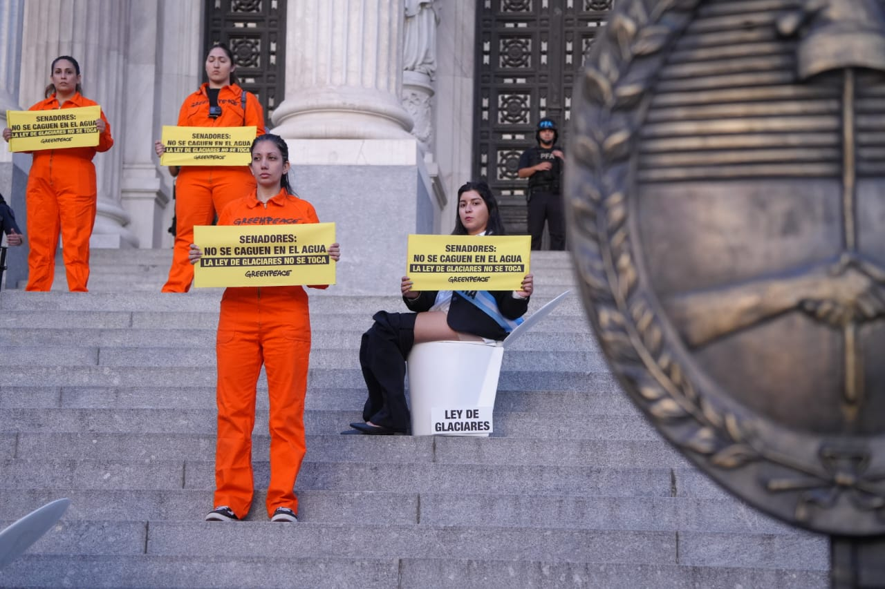 «Senadores: no se caguen en el agua», fue el cartel que desplegaron los activistas, sentados en inodoros montados en las escalinatas junto con la leyenda «la ley de glacieras no se toca». El proyecto, que tratará este jueves el Senado, propone cambios a la Ley de Glaciares que reducen su nivel de protección: limita qué glaciares y zonas quedan alcanzadas por la norma, habilita actividades productivas donde hoy están prohibidas y deja en manos de las provincias la decisión sobre qué áreas proteger, lo que podría facilitar el avance de la minería sobre reservas de agua dulce.