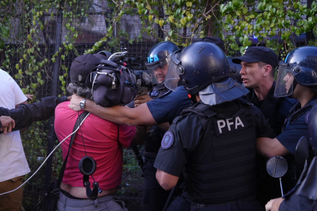 Además de detener a los activistas, la Federal arremetió con gases a periodistas que se encontraban cubriendo en el lugar, resultado herido y detenido Facundo Tedeschini, camarógrafo de A24. «El gobierno dice no odiar tanto a los periodistas y lo demuestra así», escribió en sus redes el Sindicato de Prensa de Buenos Aires.