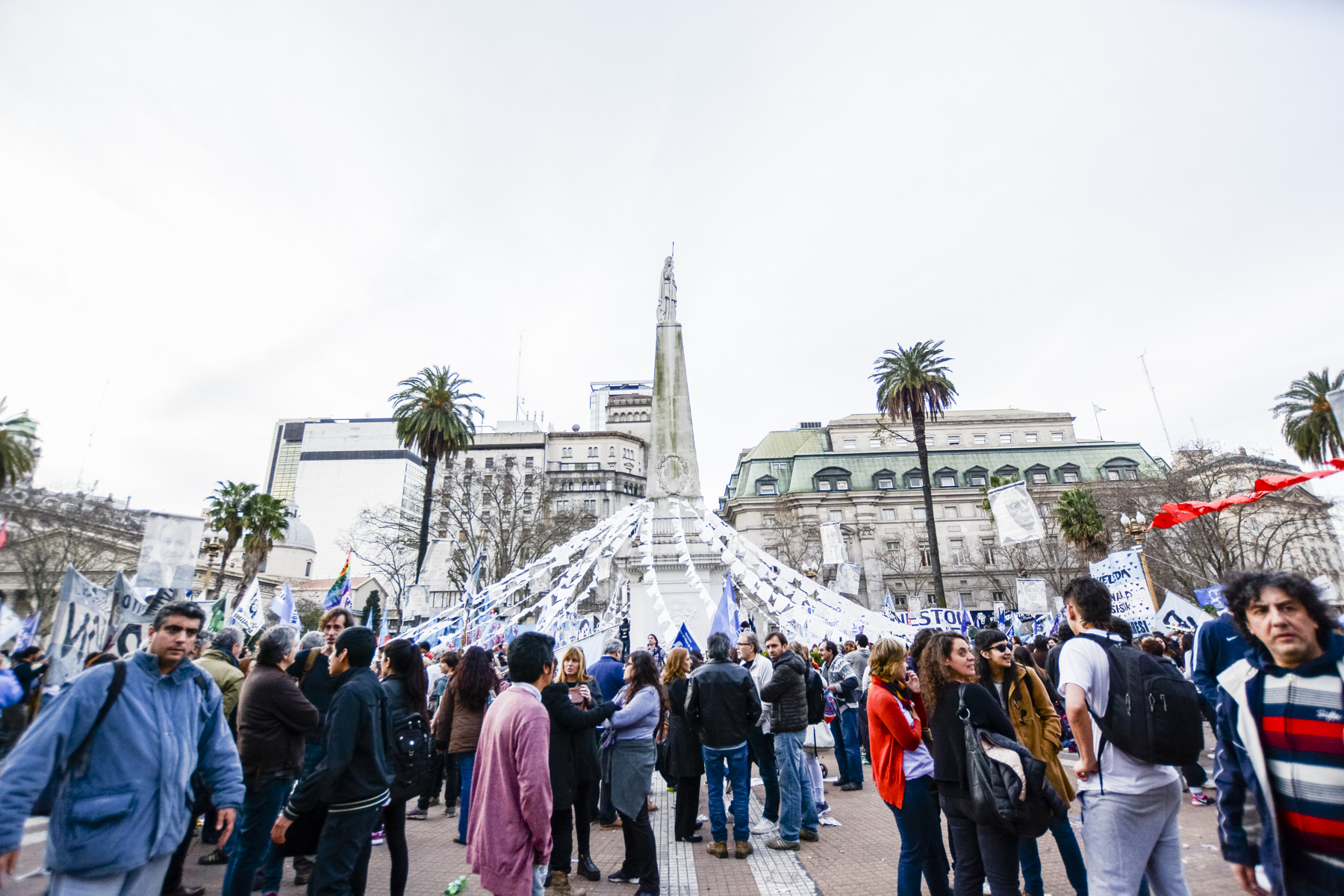 La Pirámide de Mayo estaba decorada con pañuelos blancos y al rededor se veían todas las banderas de las agrupaciones que movilizaron como La Cámpora, la Tupac Amaru, Nuevo Encuentro, Kolina, HIJOS, la Facultad de Periodismo de La Plata, Agrupación Rodolfo Walsh y muchas más.