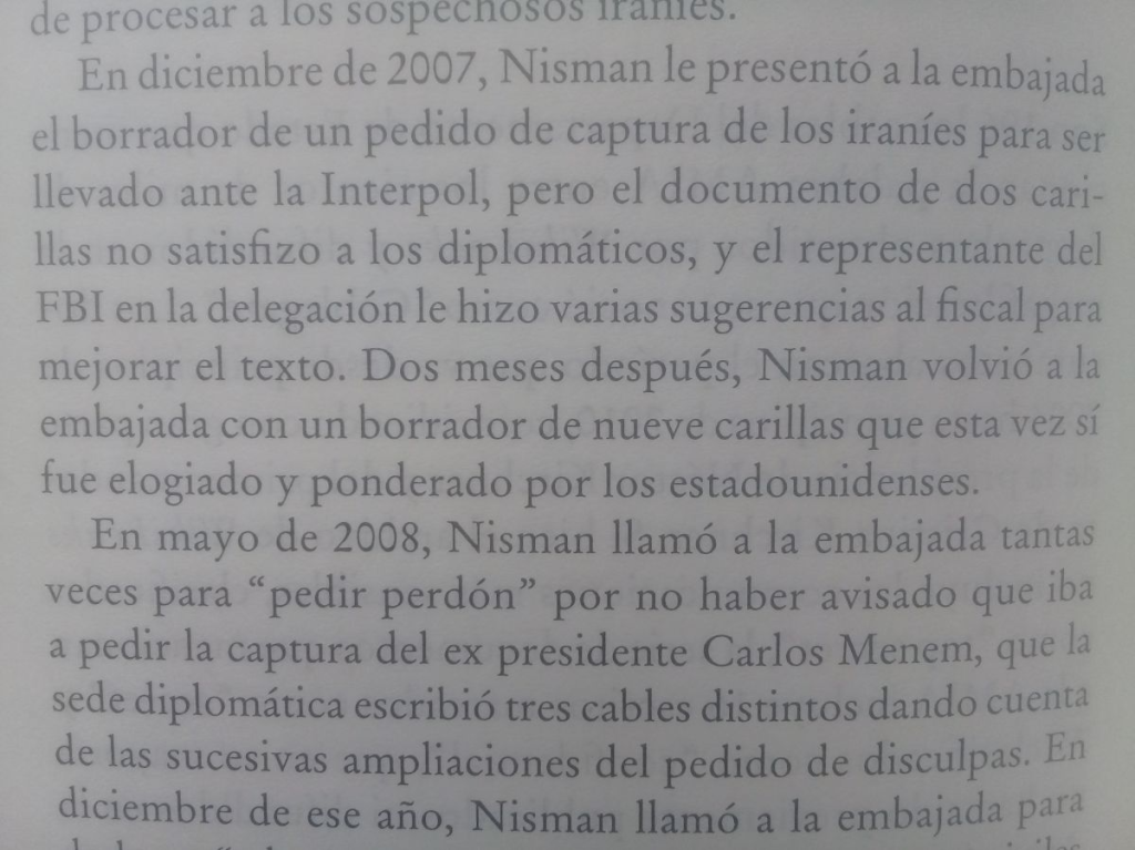 Nisman, antes de emitir sus dictámenes, los consultaba con la embajada de EEUU en Buenos Aries. Así surge de comunicaciones secretas que serían obtenidas años más tarde por la plataforma especializada en filtraciones informativas WikiLeaks, dirigida por Julian Assange. El material referido a Argentina, a su vez, fue recopilado por el periodista Santiago O’ Donnell, quien elaboró dos libros con tales revelaciones. (Se puede ver aquí abajo una foto -no profesional- del libro en papel “Politi-Leaks”, publicado en 2014. Es un recorte de la página 260).