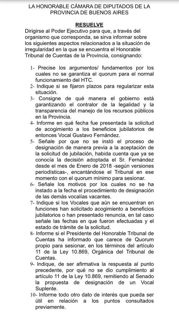 Ante esto, el bloque de diputados de la provincia de Buenos Aires de Unidad Ciudadana-FpV -PJ presentó un pedido de informes para que el Poder Ejecutivo provincial explique la situación de irregularidad en la que se encuentra el Tribunal de Cuentas bonaerense.