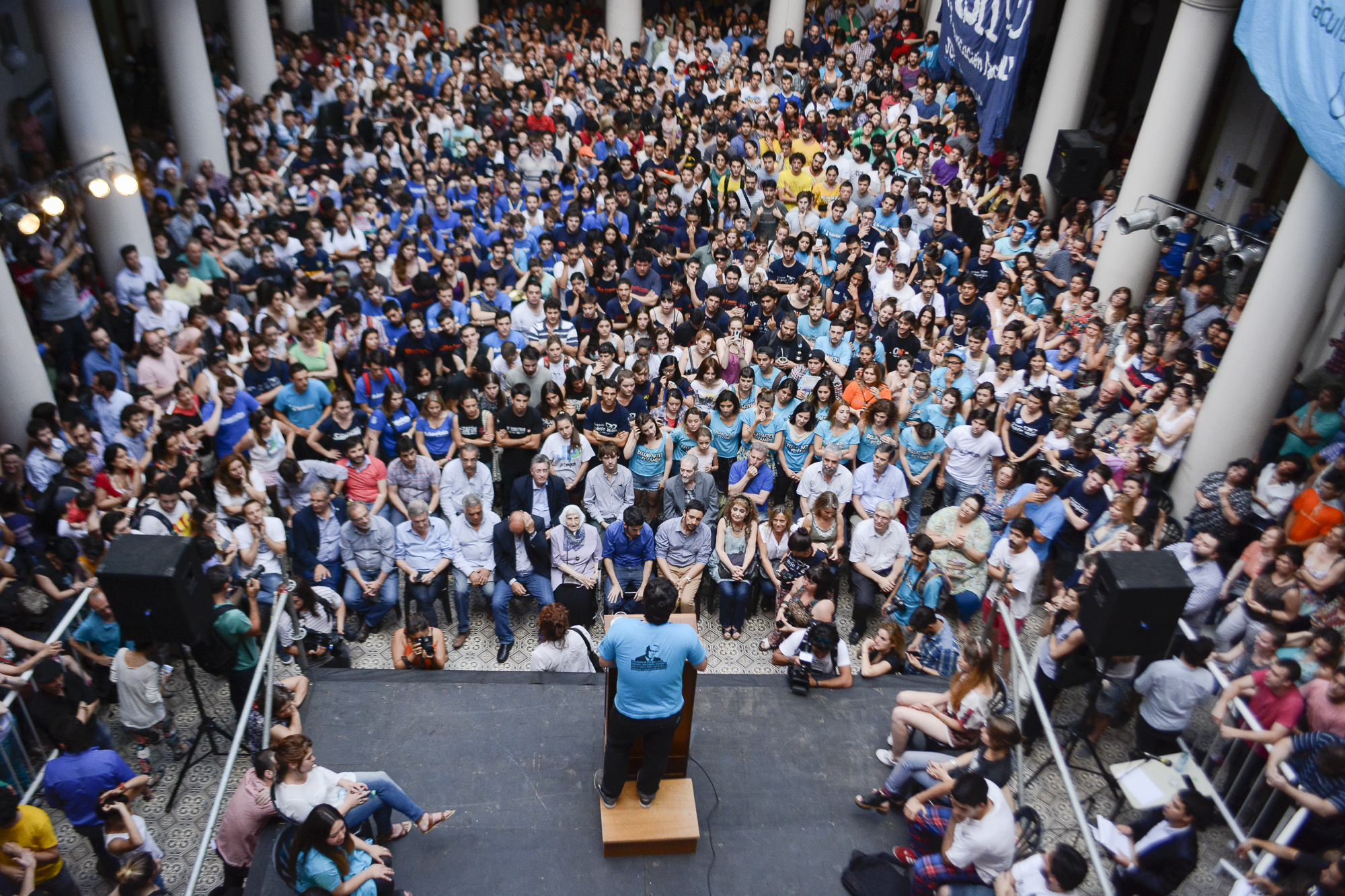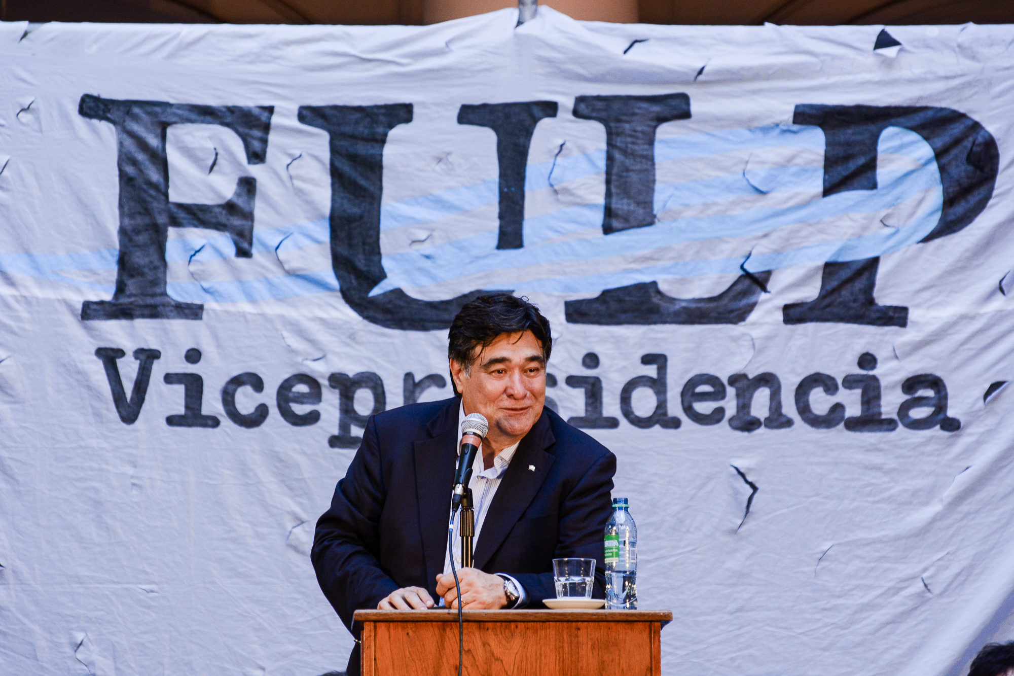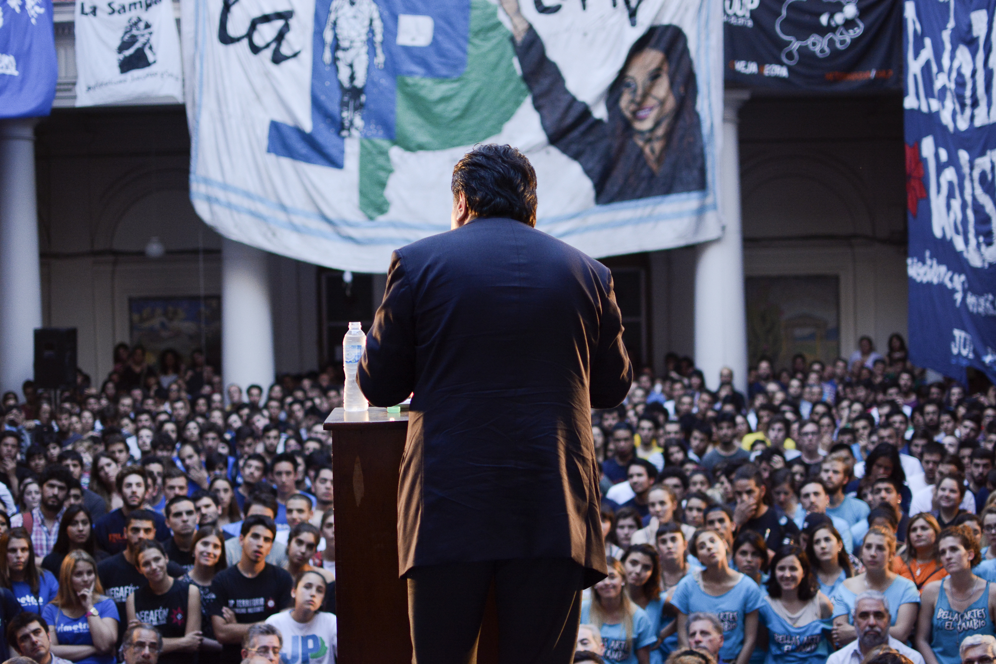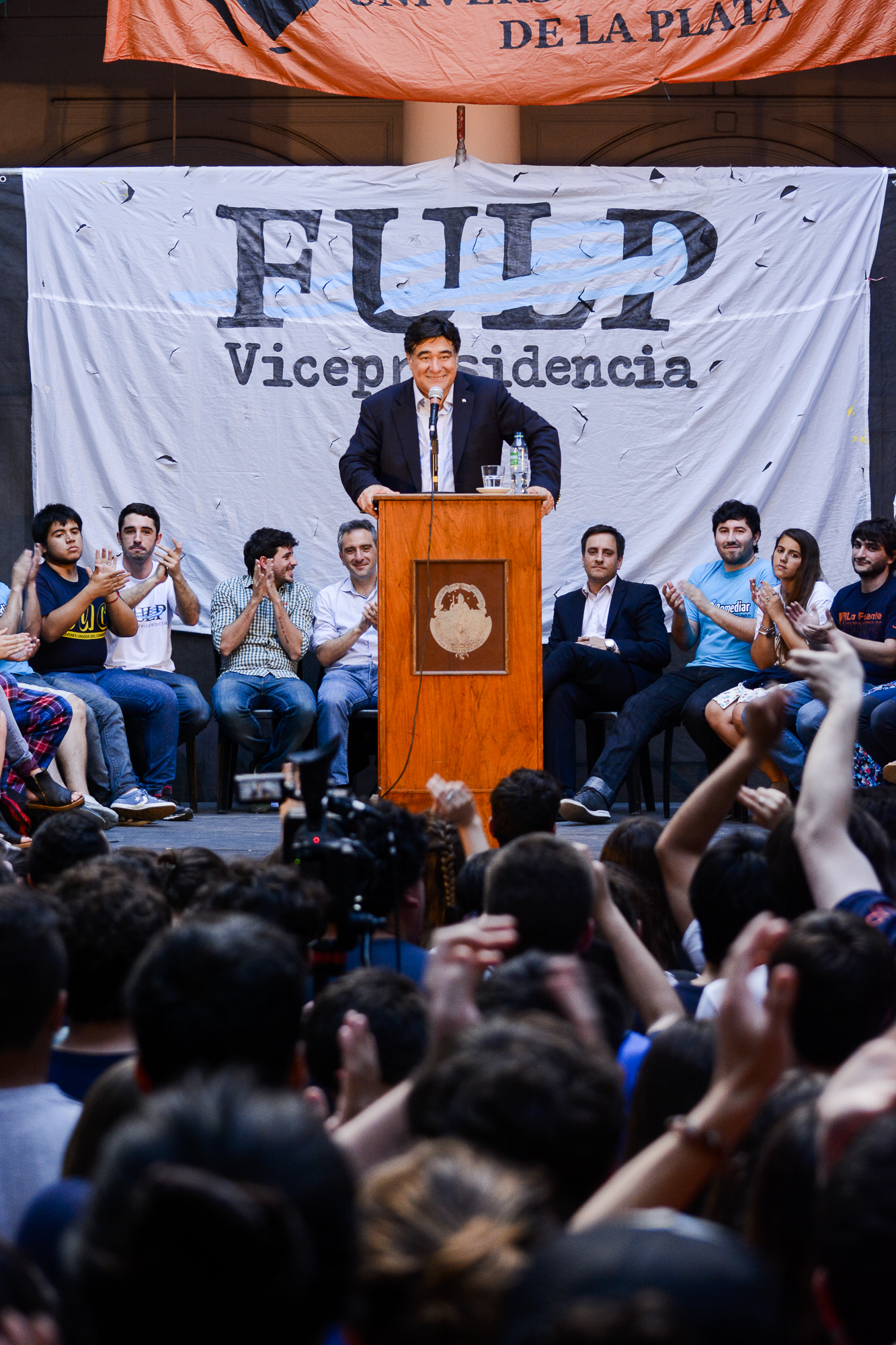 Luego de arribar a la sede de calle 7 en compañía de Juan Cabandié y Andrés “Cuervo” Larroque, el candidato a vicepresidente habló ante la efusiva concurrencia de estudiantes, docentes, diversas autoridades y figuras presentes. Acompañaron el acto la Madre de Plaza de Mayo Adelina Alaye, el intendente de Ensenada, Mario Secco, el diputado Mario Oporto y la concejala platense Florencia Saintout, entre otros referentes. También estuvieron las decanas de Trabajo Social, Bellas Artes, Observatorio, los decanos de Ciencias Agrarias, Ingeniería y el vicedecano de Psicología.