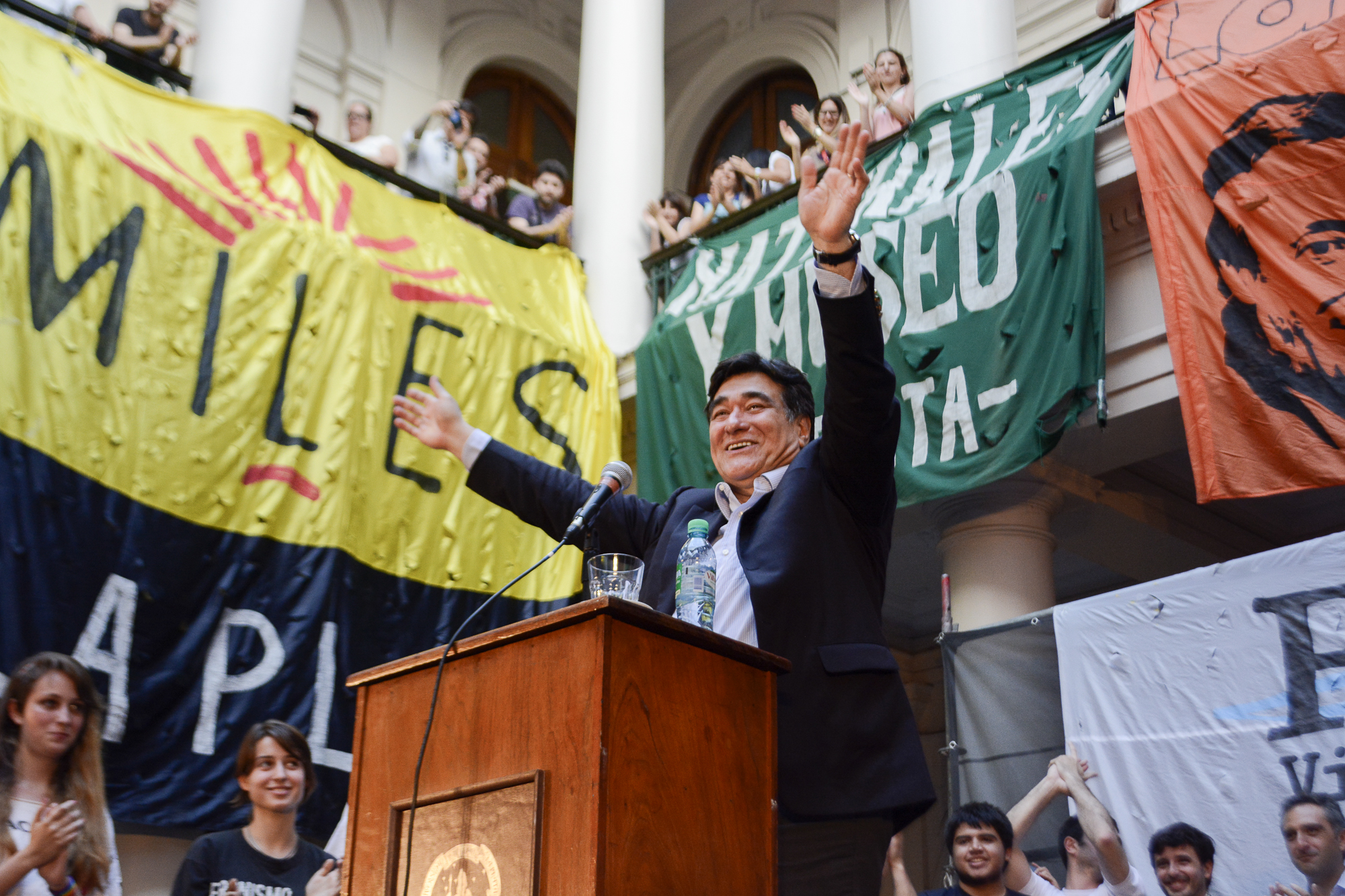 Carlos Zannini entonó la marcha peronista por primera vez en agosto de 1975, mientras se encontraba prisionero en Córdoba. La misma marcha que ayer lo recibió en el rectorado de la Universidad Nacional de La Plata, en voz de cientos de estudiantes que asistieron a acompañar al candidato a la vicepresidencia de la nación. “Es un signo de estos tiempos. Yo viví cuando el prestigio y la hegemonía de la Franja Morada era muy fuerte. Yo llegué apenas a secretario de deportes en el Centro de Estudiantes”, bromeó el “Chino”, en diálogo con Contexto, refiriendose al triunfo de las agrupaciones estudiantiles del kirchnerismo en las diferentes casas de estudio de la UNLP. “Son otros tiempos y creo que tiene que ver con un proceso muy profundo de valorización de lo argentino, de valorización de lo propio, de fortalecimiento de la autoestima, y de un montón de elementos maravillosos que se despiertan cuando hay un proceso de redistribución del ingreso que favorece a los que menos tienen. Que pone el acento en la educación pública y no en el mercado”.