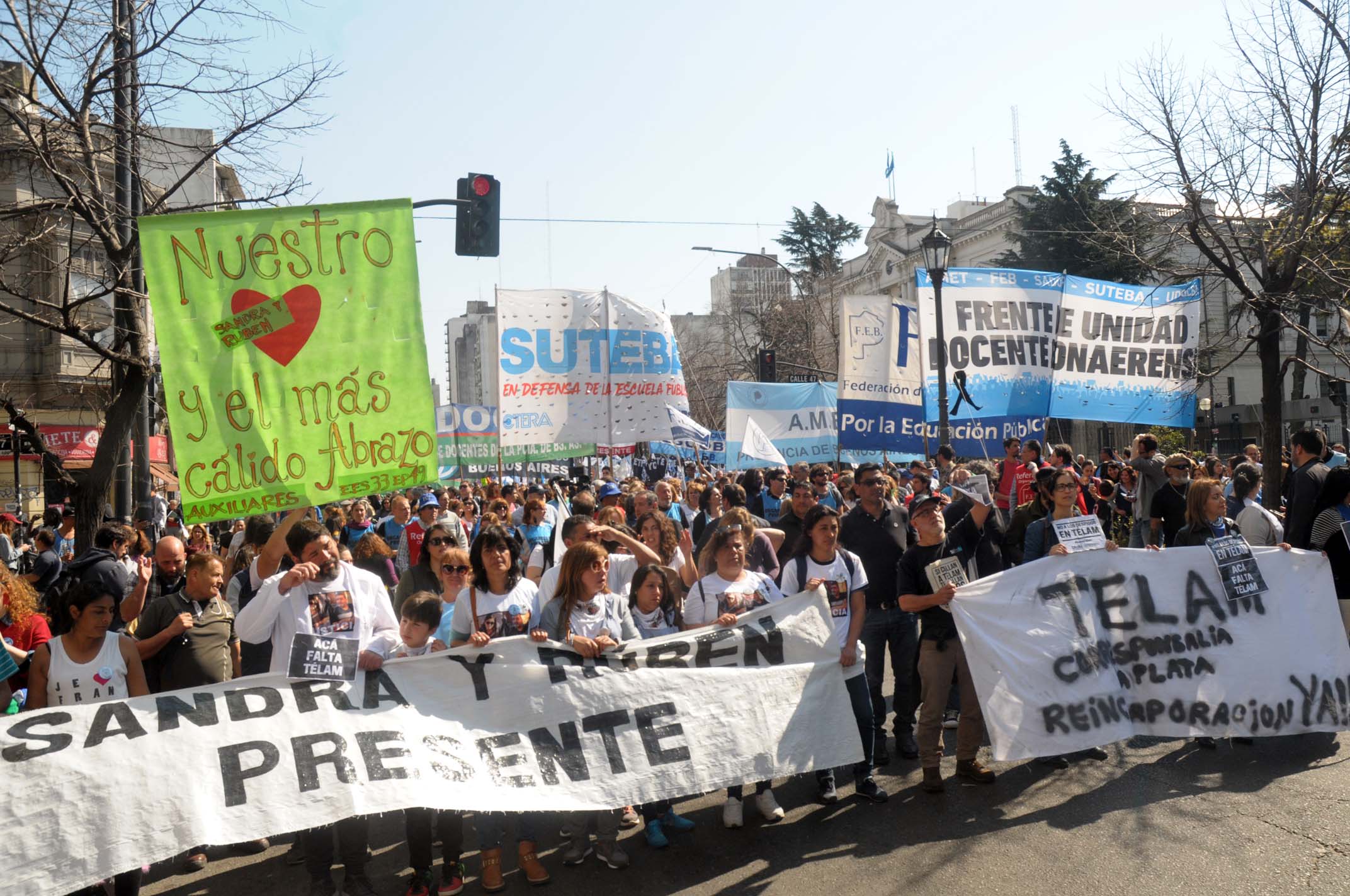 “En estas 72 horas dimos el ejemplo diciendo que la dignidad no se vende, que la escuela pública se defiende”, fueron las primeras palabras del titular del gremio docente SUTEBA, Roberto Baradel, quien llamó a un paro de 36 horas frente a una multitud que colmó Plaza San Martín. Allí estuvieron representantes del Frente conformado por SADOP, FEB, SUTEBA, UDOCBA y AMET, junto al titular de ATE en el Astillero Río Santiago, Francisco Banegas y el representante del gremio estatal en provincia, Oscar De Isasi.