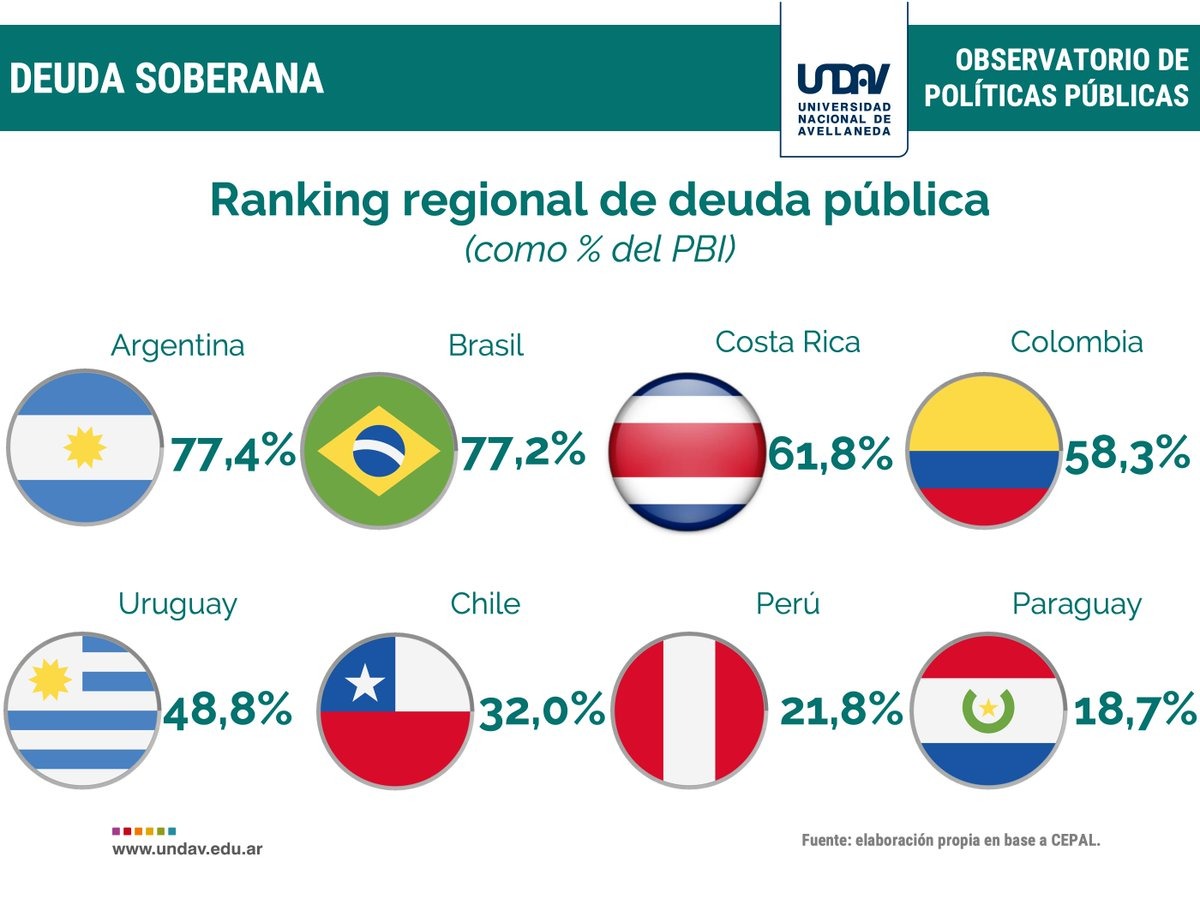 En la comparación con los demás países de América Latina, “Argentina superó a El Salvador y Brasil y quedó primero en el ranking de los países con mayor ratio deuda pública sobre PBI”, detallan los economistas de la UNDAV. Con un aumento de más del 30% respecto a diciembre de 2015, la deuda pública ahora representa el 77,4% del total del PBI. “La deuda externa argentina creció 56% en el periodo siendo el país que mayor incrementó su deuda pública y privada con no residentes”.