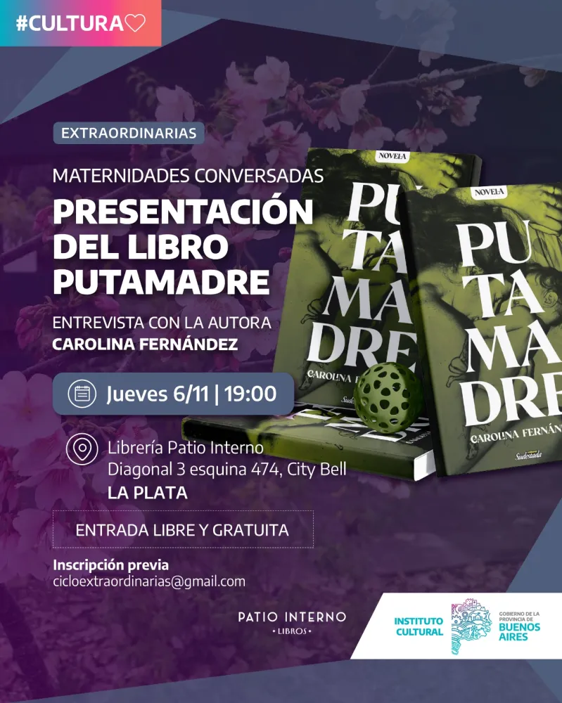 El Instituto Cultural de la Provincia de Buenos Aires presenta una nueva edición del ciclo Entrevistas Extraordinarias, bajo la consigna “Maternidades conversadas” en esta oportunidad tendrá como invitada a Carolina Fernández, que presentará en una entrevista abierta su último libro Putamadre. El encuentro se realizará el jueves 6 de noviembre a las 19:00 en la Librería Patio Interno (Diagonal 3 esquina 474, City Bell). Con entrada libre y gratuita con inscripción previa mediante formulario.