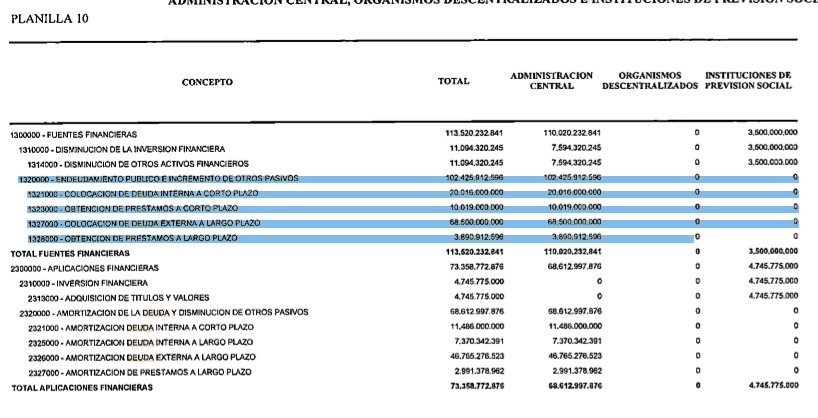 Según la planilla N° 10, el “endeudamiento público e incremento de otros pasivos alcanza un total de $102.425.912.596. Para llegar a ese número se tiene en cuenta la deuda externa ya mencionada pero también deuda interna a corto plazo, préstamos a corto plazo, y préstamos a largo plazo”.