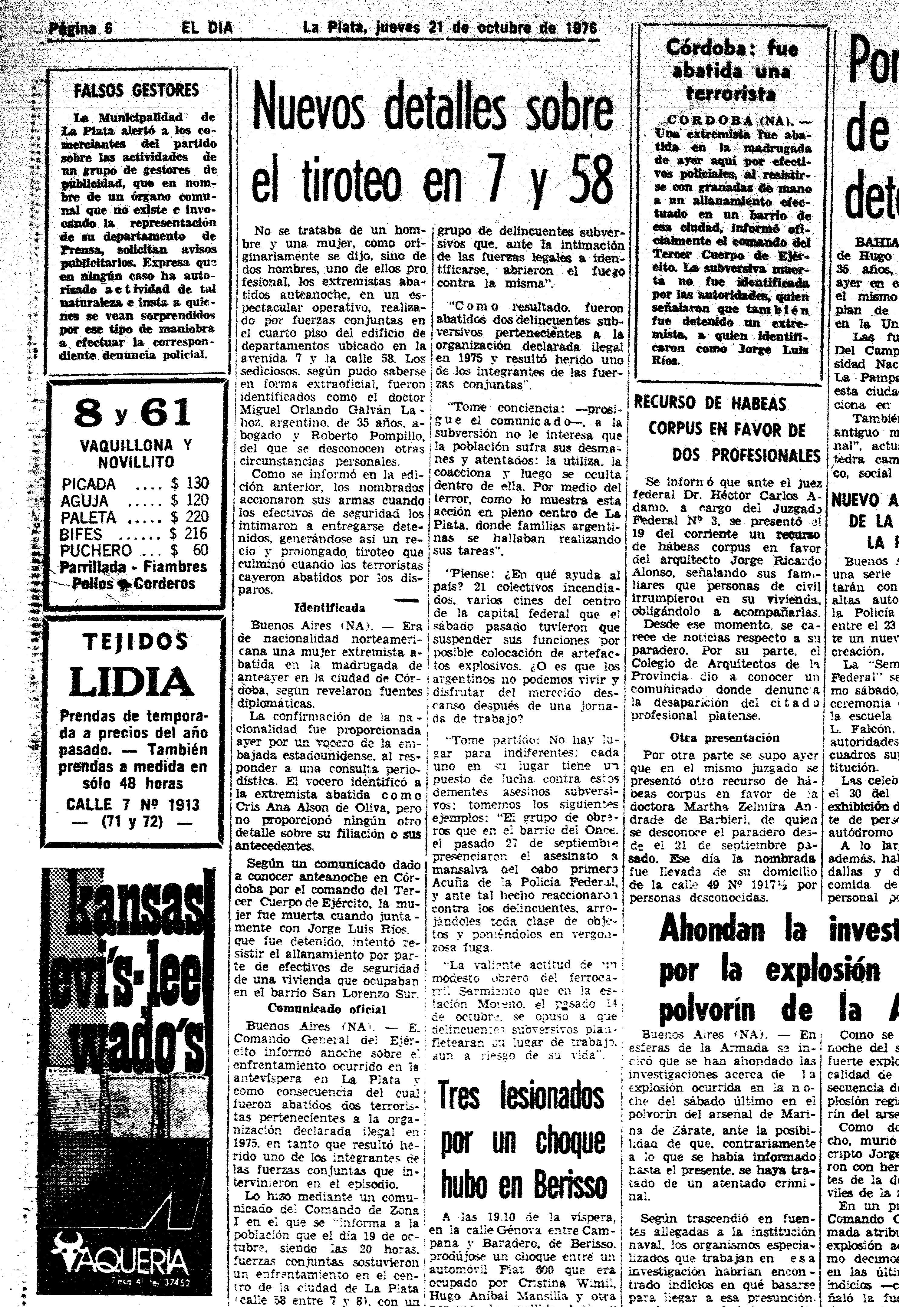 Al día siguiente del ataque en el que fueron asesinados Galván Lahoz y Roberto Pampillo en un departamento del cuarto piso de un edificio de 7 y 58, El Día publicó una nota que, en su primera línea, consignaba: “Una pareja de extremistas murió anoche”. En el resto de la crónica aclara que en el operativo había actuado “personal de civil provisto de armas largas” y que las fuentes eran “extraoficiales”. Ya sobre el final del relato indica que “versiones recogidas en el lugar señalan que el hombre (Ndr: Galván Lahoz) era un profesional joven al igual que la mujer que lo acompañaba, que sería su esposa”.