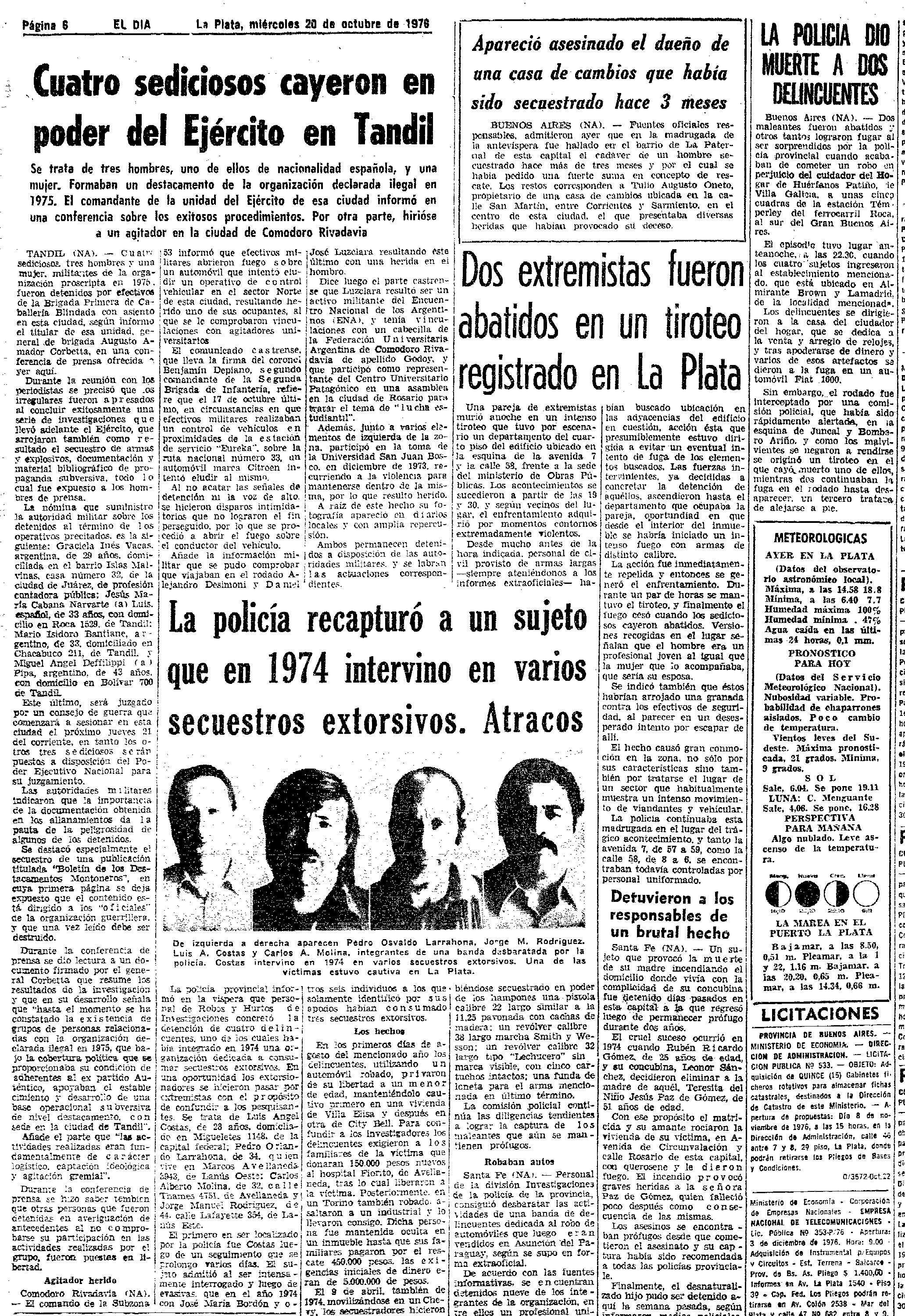 “Dos extremistas fueron abatidos en un tiroteo registrado en La Plata”. Con ese título el diario El Día registró, el 20 de octubre de 1976, el asesinato de dos abogados militantes cometido por “fuerzas conjuntas” de la dictadura en pleno centro de la capital bonaerense. El artículo, uno más de los cientos en los que durante la dictadura cívico-militar el diario de la familia Kraiselburd registró el asesinato de militantes del campo popular bajo la denominación de subversivos, extremistas o sediciosos, fue recordado el lunes por los hijos de Miguel Galván Lahoz, una de las dos víctimas de ese desmesurado ataque, durante la audiencia del juicio que el Tribunal Oral en lo Criminal Federal N° 1 de La Plata realiza a represores de la Armada y la Prefectura Naval de la región. Pero en su declaración los testigos remarcaron que la noticia del diario daba por muerta a su madre, que, si bien tenía programado estar en ese lugar a la hora del ataque, no había concurrido. Ese episodio volvió a poner de manifiesto en un juicio el acceso a la información de los servicios de Inteligencia que el matutino platense mantuvo durante los años del terrorismo de Estado.