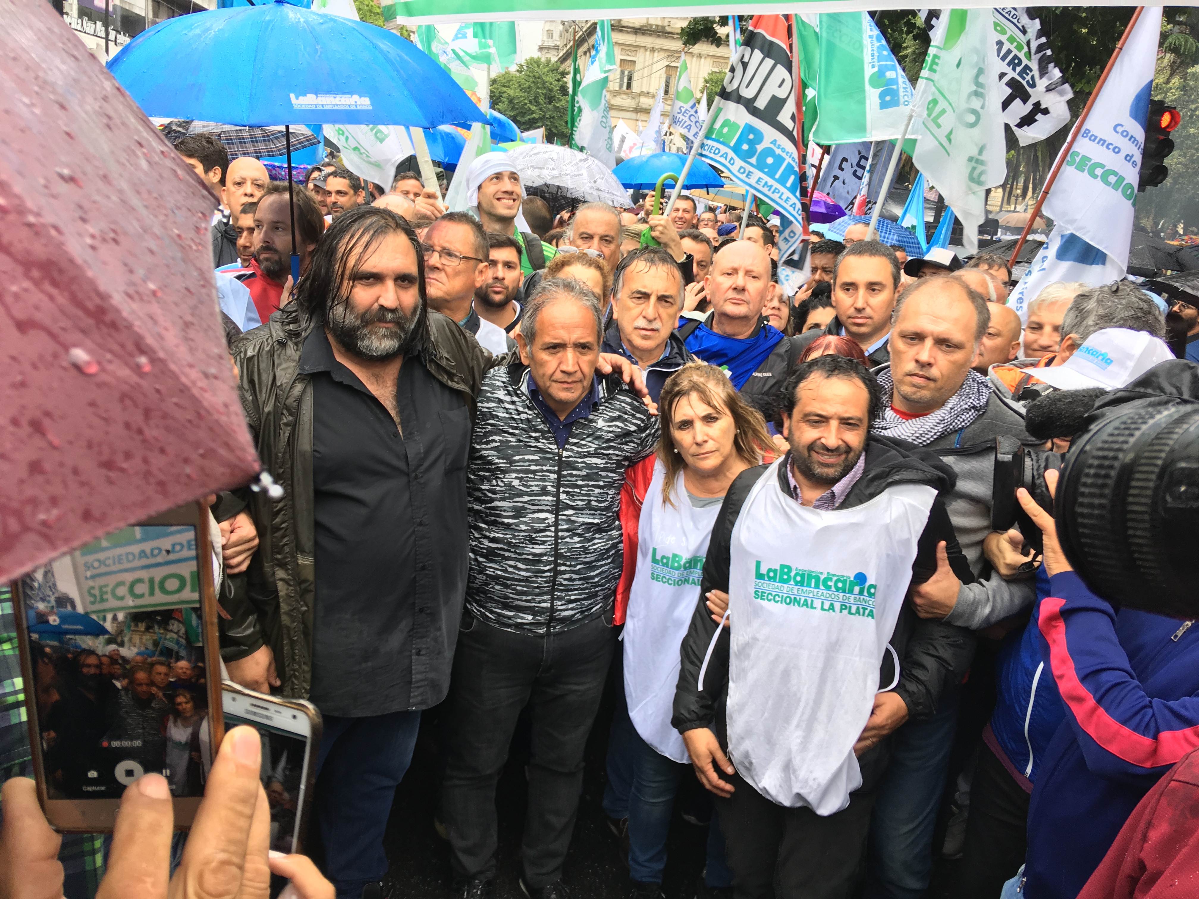La manifestación se desarrollo bajo una incesante lluvia. En la protesta en contra del proyecto que afectará de manera directa haberes y la edad jubilatoria, el gremio conducido por Sergio Palazzo extendió el paro hasta hoy y aseguró que el jueves y viernes creará asambleas para discutir un nuevo plan de lucha. La consigna que resonó durante toda la tarde fue unánime: paro general e indeterminado.