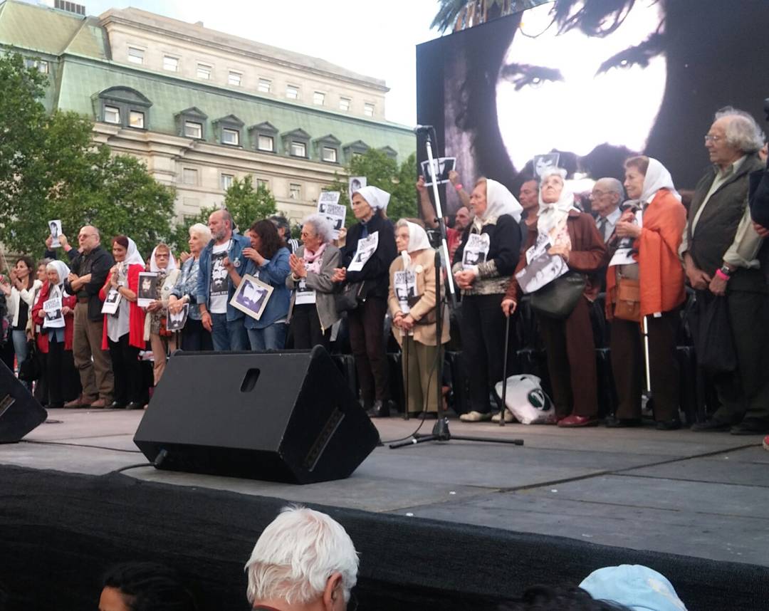 Junto a él estuvieron distintos referentes de los organismos de derechos humanos, como Estela de Carlotto, presidenta de Abuelas de Plaza de Mayo, Taty Almeida, de Madres-Línea Fundadora, José Schulman, secretario nacional de la Liga Argentina por los Derechos del Hombre (LADH) y Pablo Pimentel, titular de la APDH La Matanza. Al escenario también subió Alberto Santillán, el padre de Darío, asesinado junto a Maximiliano Kosteki en la represión del 26 de junio de 2002 conocida como la Masacre de Avellaneda.