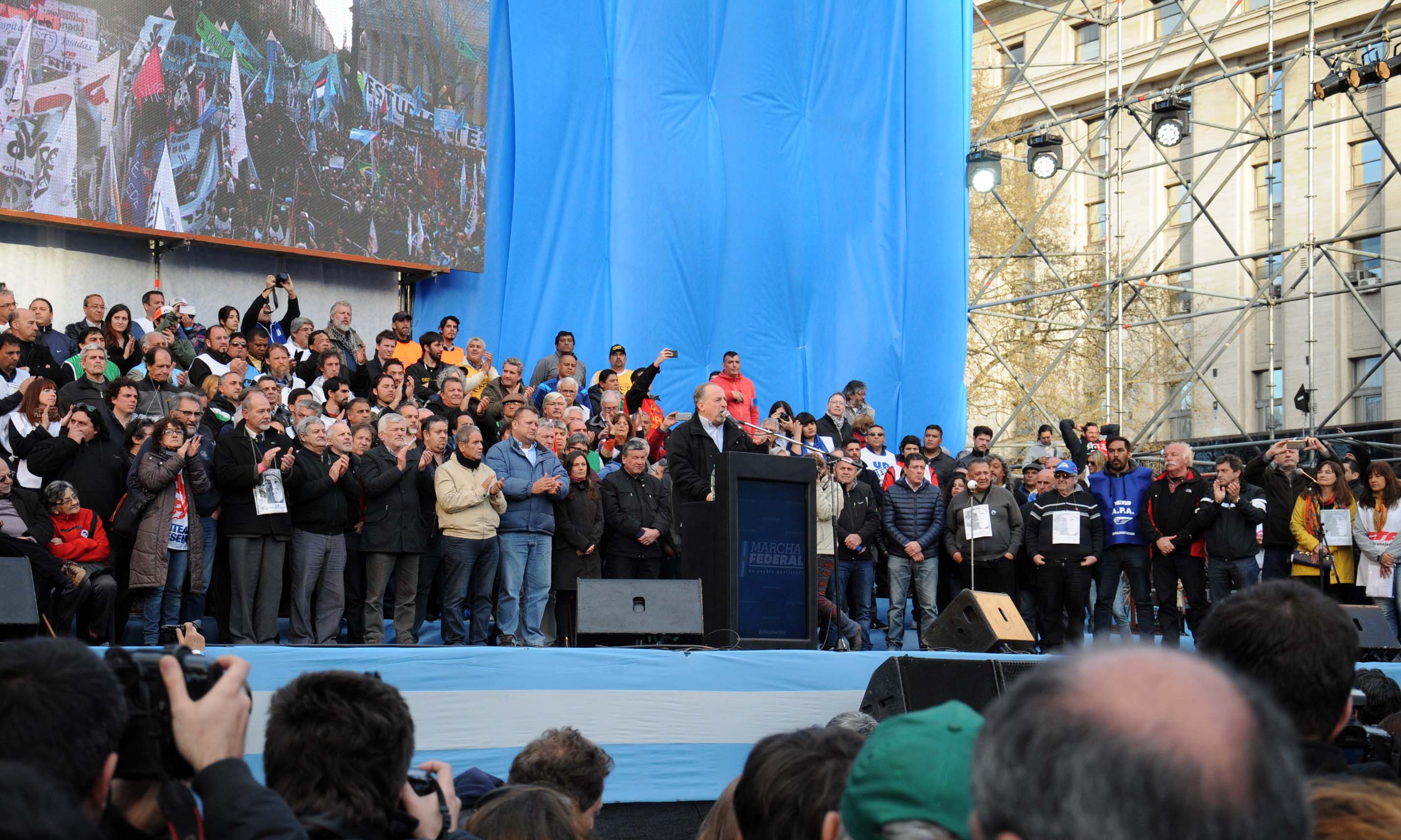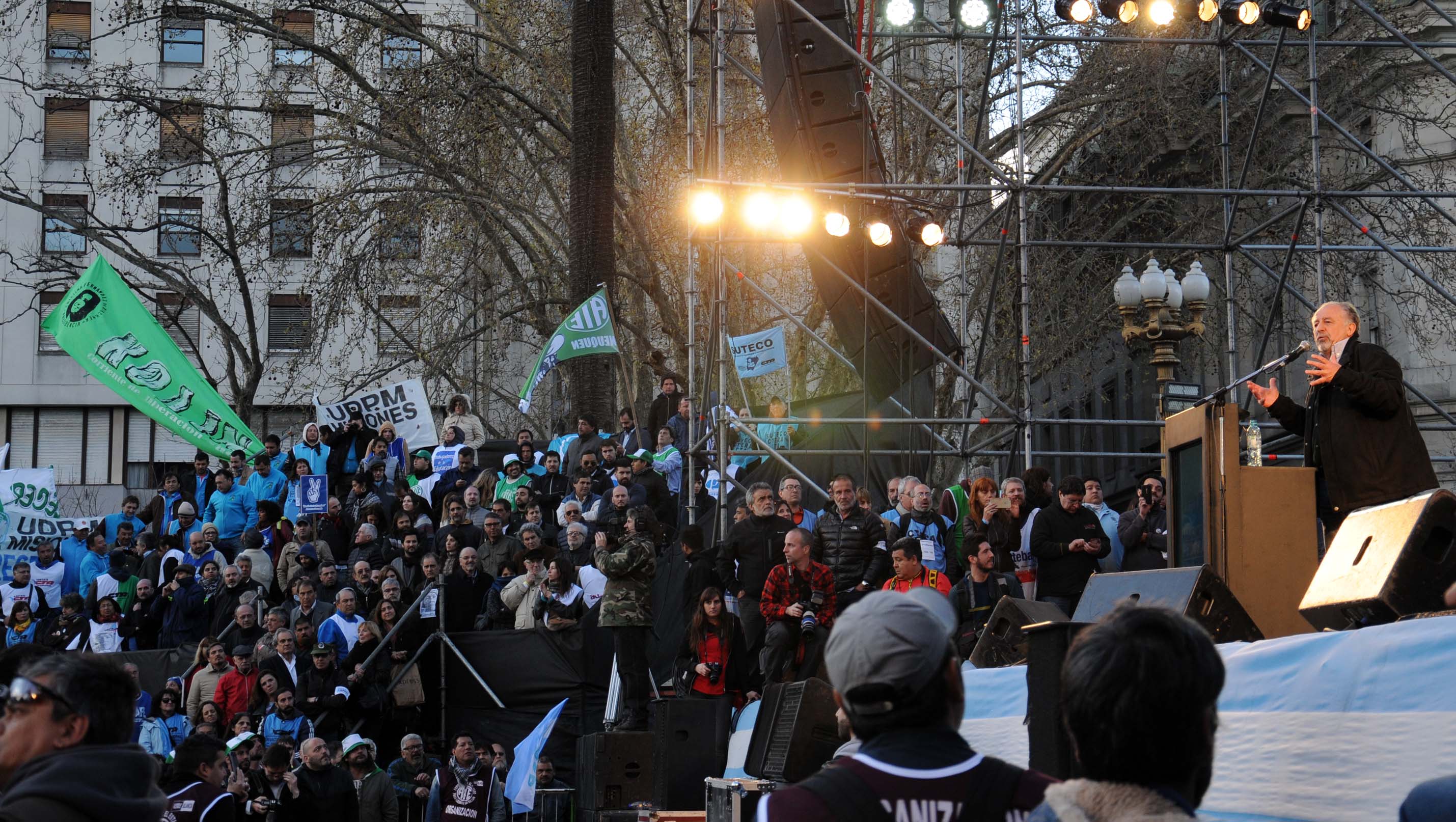 Hacia las 17 horas tuvo inicio el acto central en Plaza de Mayo, con un escenario concurrido por diversas figuras como Estela de Carlotto, Luis D’Elía o Gabriel Mariotto, en compañía de representantes de ATE, CTA y la CGT, gremios clave en una marcha cuyo espíritu remitió a las grandes resistencias gremiales contra el menemismo durante la década de los noventa.