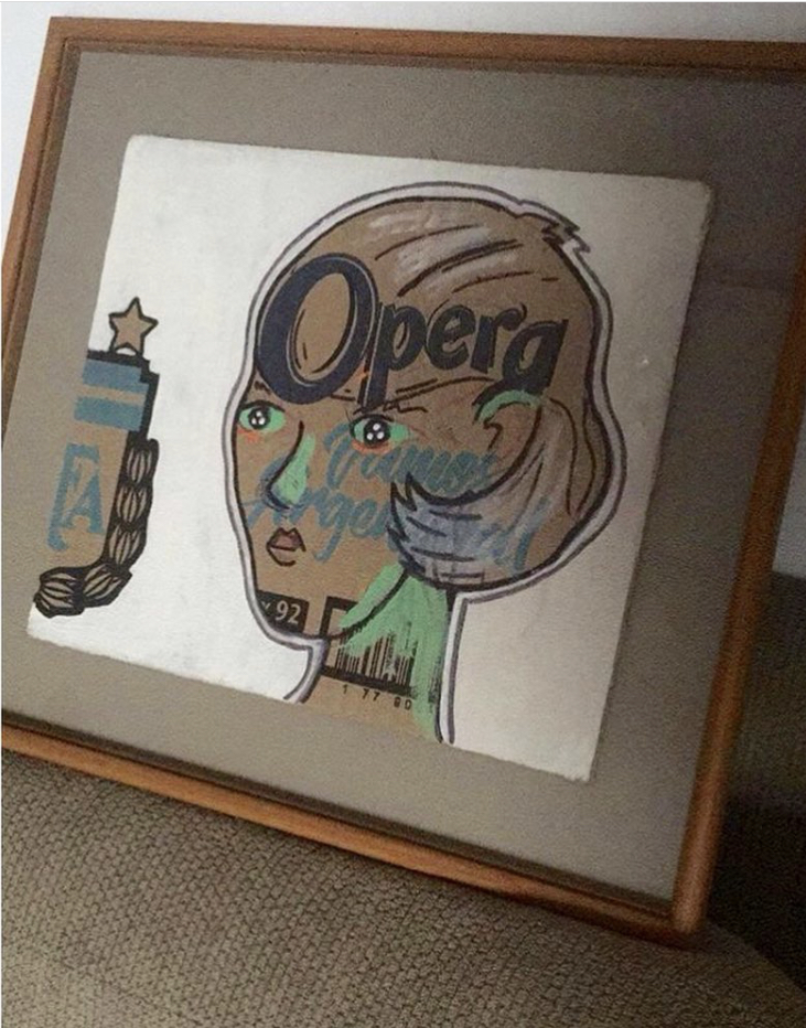 Un tristemente célebre fiscal apremiado por virtuales agentes y sicarios “K” sobre cartones rosados son una muestra de su obra sobre cartones. “Me siento más cómodo. Nunca pinté en una tela. Pero no es solo pintar el cartón, que de por sí tiene una historia. Aprovechaba y hacía cosas. En un principio empezaba a intervenir sobre lo que ya tenía la caja”. Respecto a los bordados considera que es importante situarlos en el momento. “Eso es algo que realmente creció mucho”, explica. Y agrega: “Si lo ves, no tiene una técnica. En ese momento no tenía ninguna referencia, lo único que aparecía eran unos bordados viejos, no había contenido. Después el bordado se fue ubicando en un lugar muy estético y me dejó de interesar”.