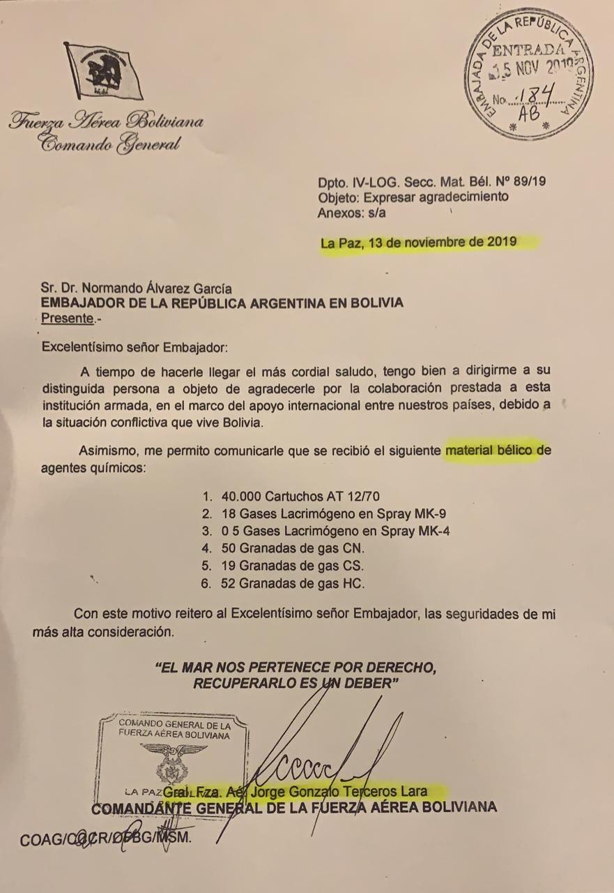 El funcionario exhibió un documento, firmado por el entonces comandante general de la Fuerza Aérea boliviana, Jorge Gonzalo Terceros Lara, con fecha de 13 de noviembre de 2019, en el que el militar le agradece al Gobierno argentino –a través del entonces embajador de Argentina en Bolivia, Normando Álvarez García– el envío de armas.