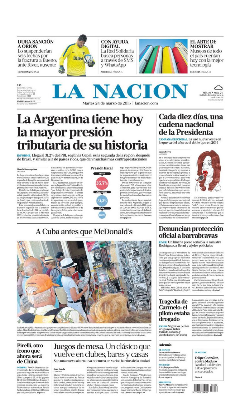 Los tres decidieron, en tanto, tener como título principal de portada la presión tributaria de Argentina. Cada uno a su estilo, se escandaliza del porcentaje que el Gobierno recauda en concepto de impuestos. Pero nada de dicen si hay o no contraprestación. De los diferentes planes de la ANSES, por ejemplo, ni una palabra.