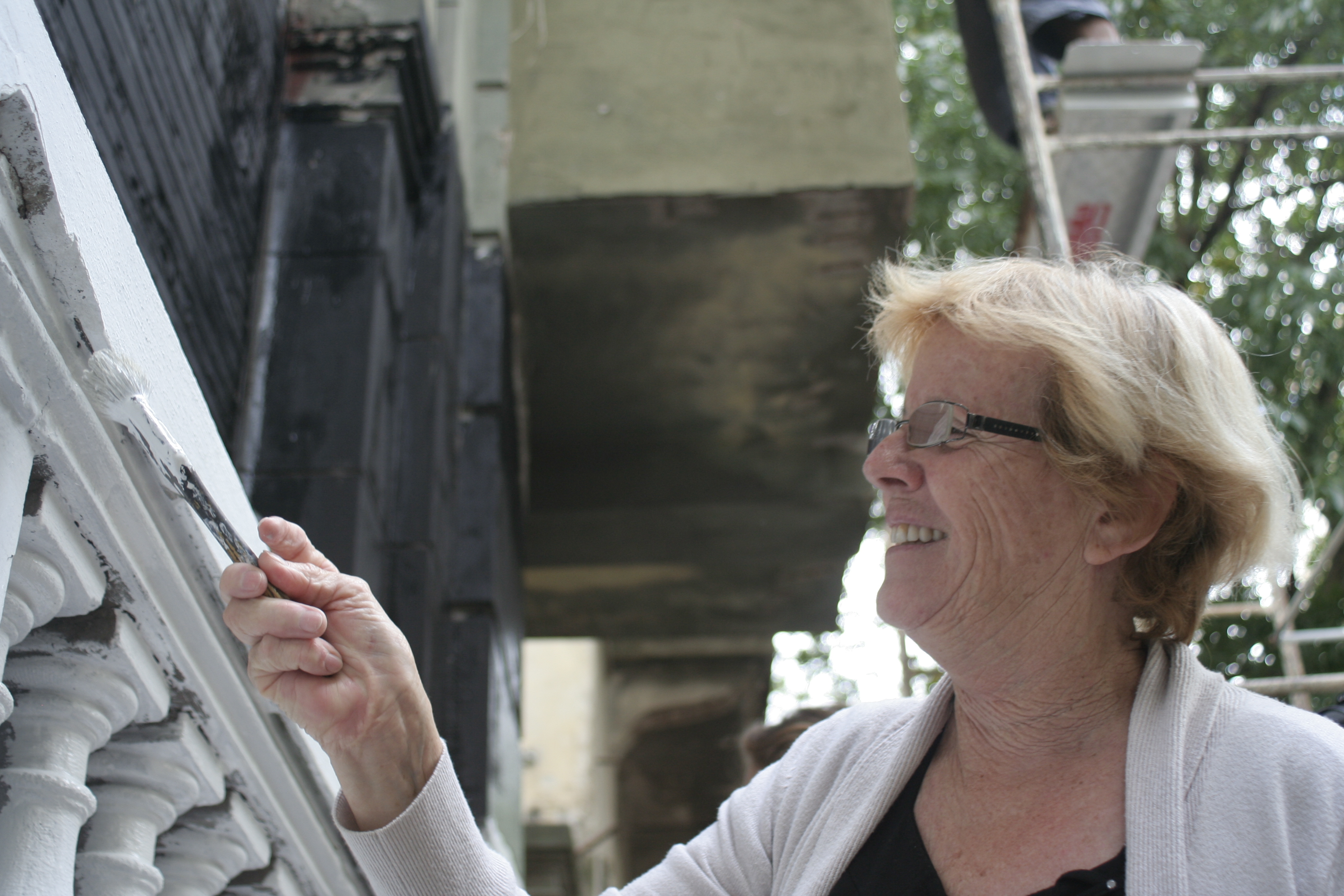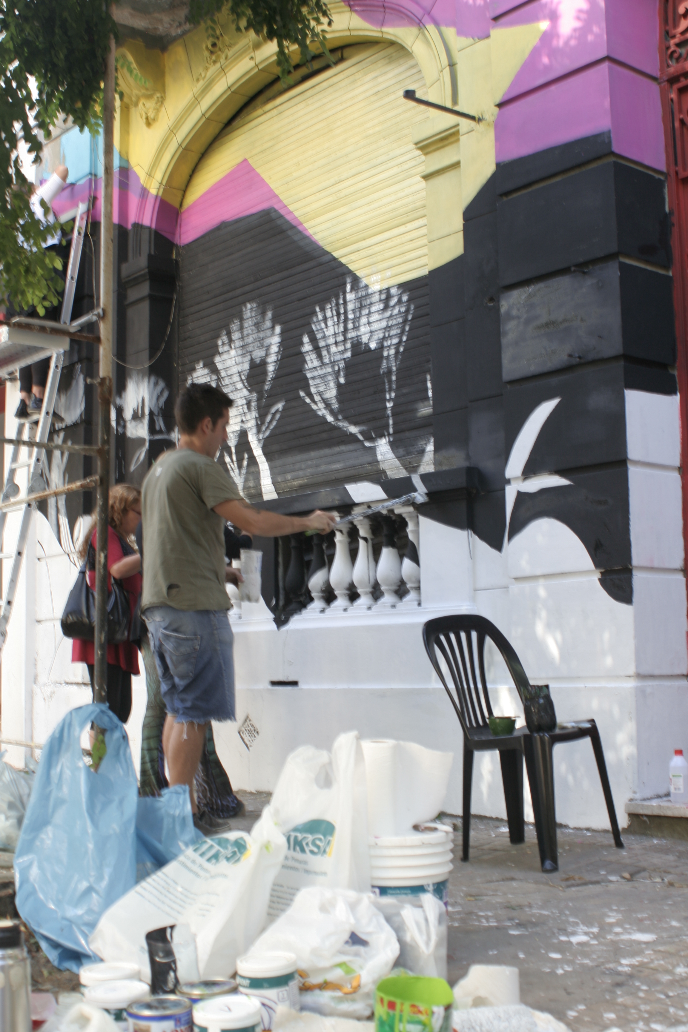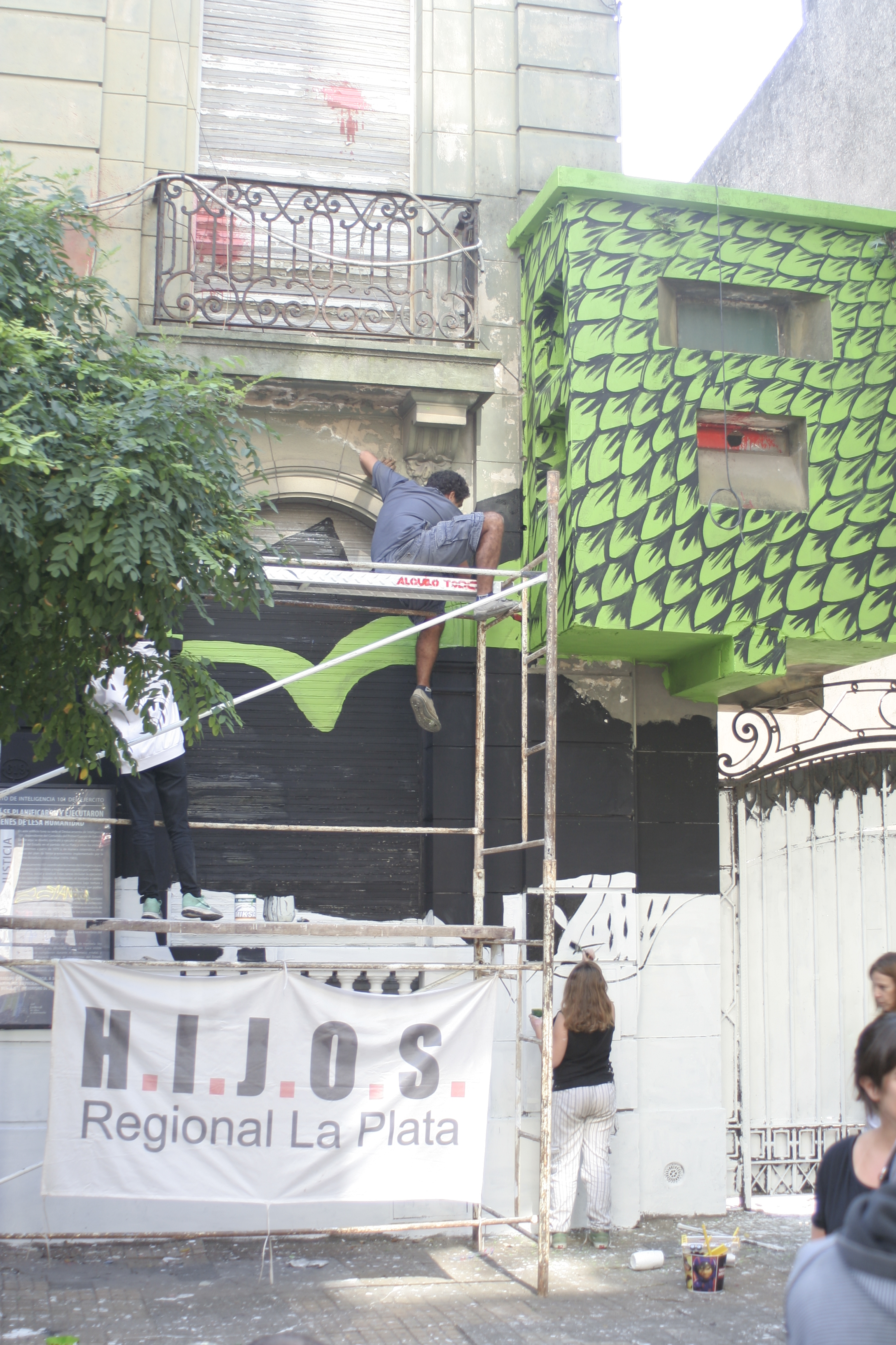 Para pintar el mural los H.I.J.O.S llegaron temprano. La mayoría de la mano de sus hijos, que rápidamente se organizaron como una pequeña brigada muñida de pinceles con los que blanquearon el portón de acceso a la casona. Los adultos armaron los andamios, prepararon la pintura y prendieron el fuego en el cordón para hacer los choris.