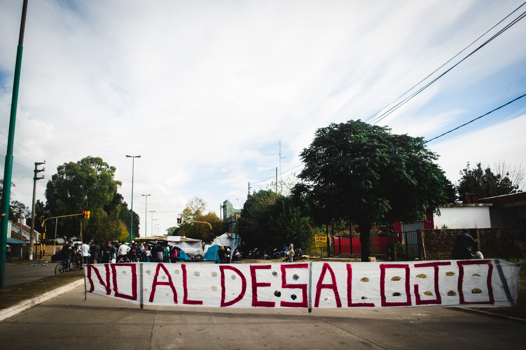 “No al desalojo”, anuncia un pasacalle que atraviesa la 520 a la altura de 211. El imperativo es el mismo que utilizan los vecinos cuando dicen que quieren recuperar las tierras que habían tomado hasta que la policía entró mientras dormían en la madrugada del jueves 7 de mayo y los reprimió, echándolos a la fuerza.