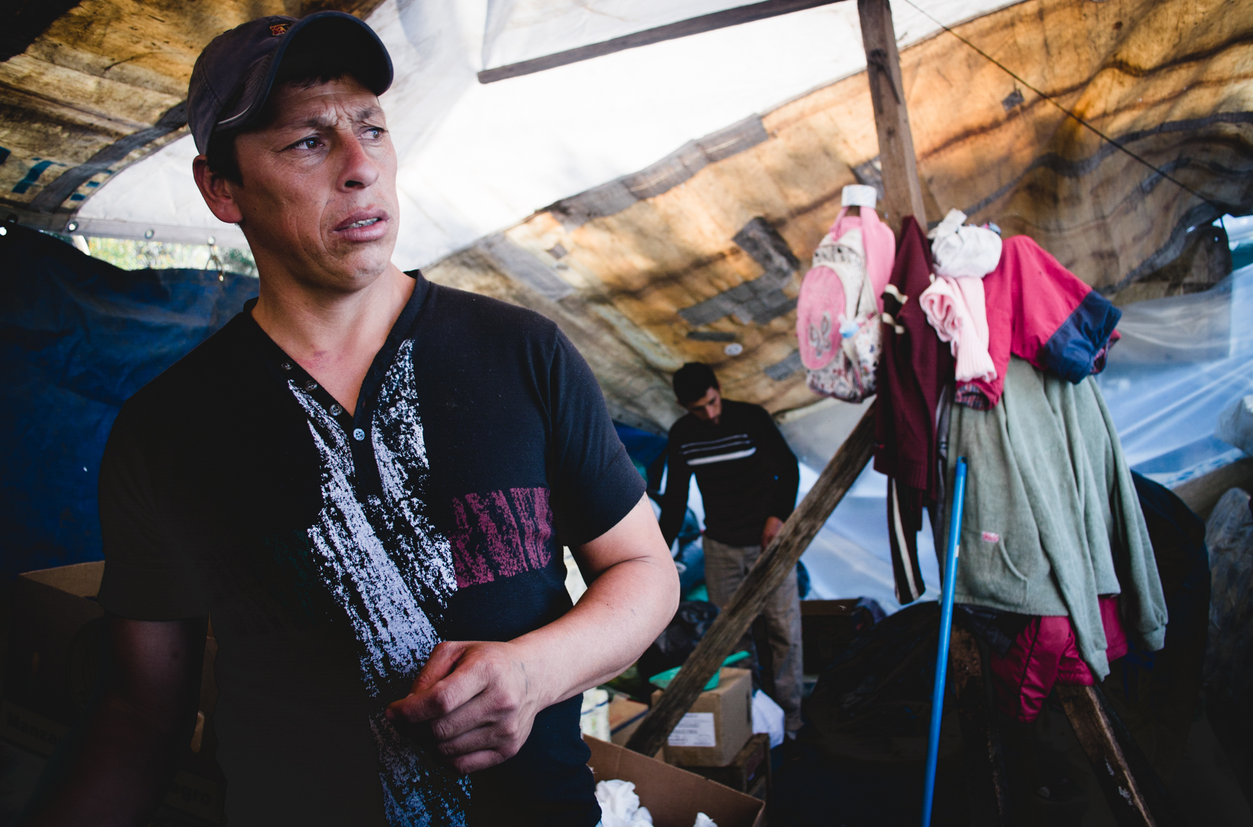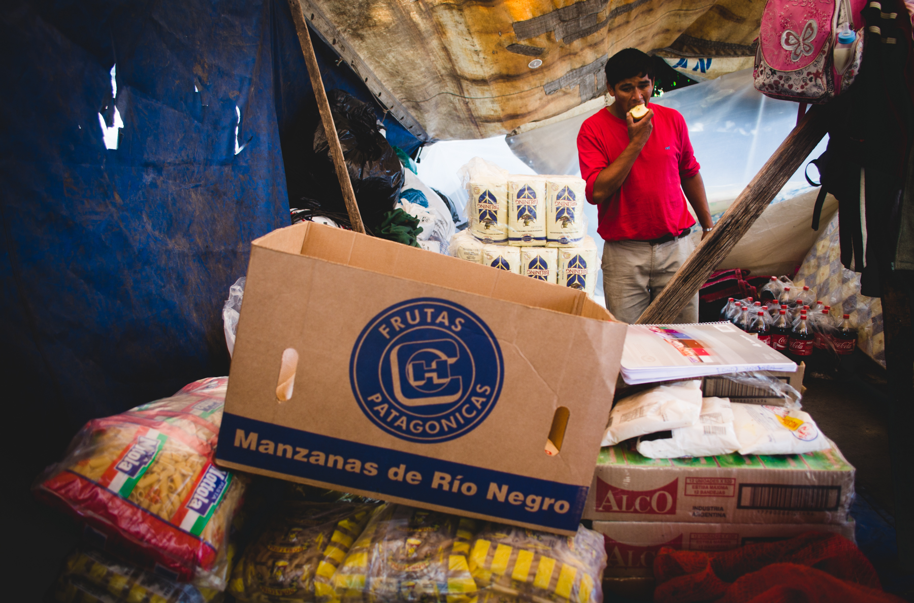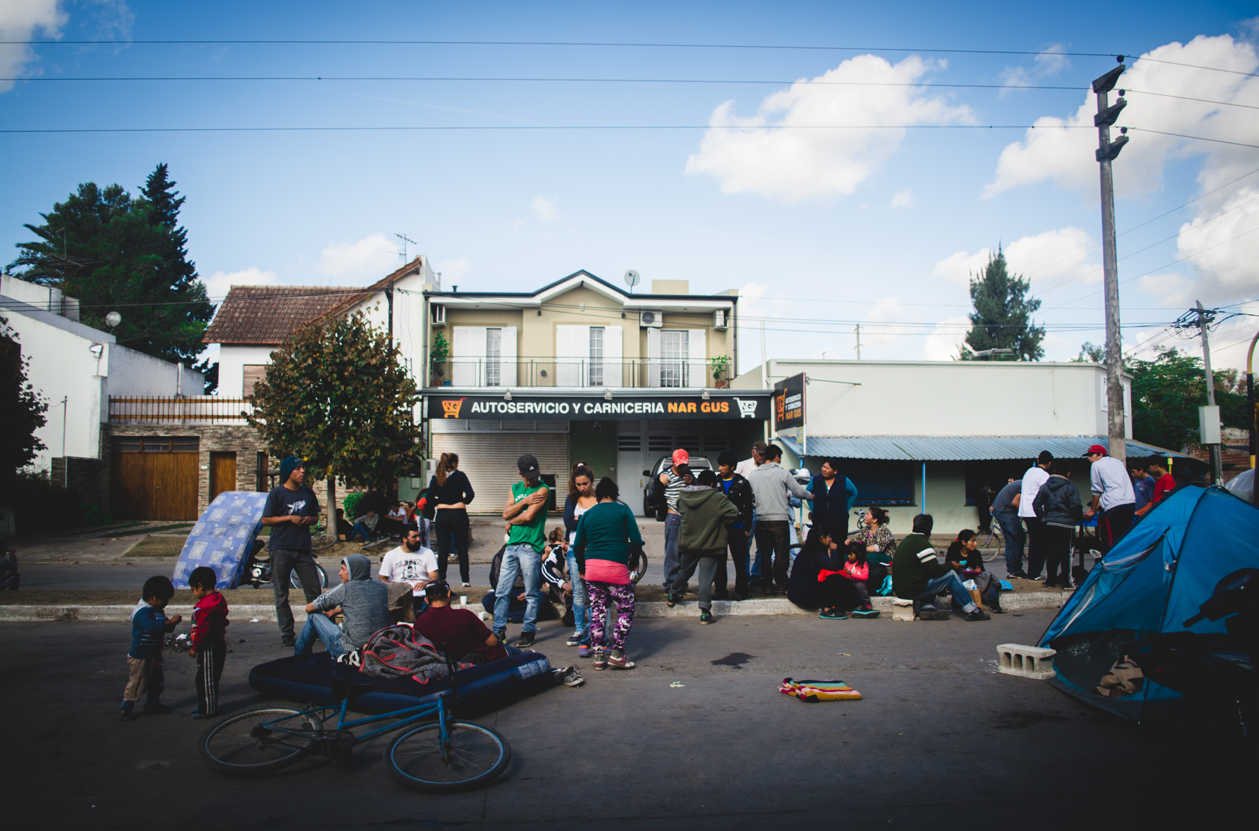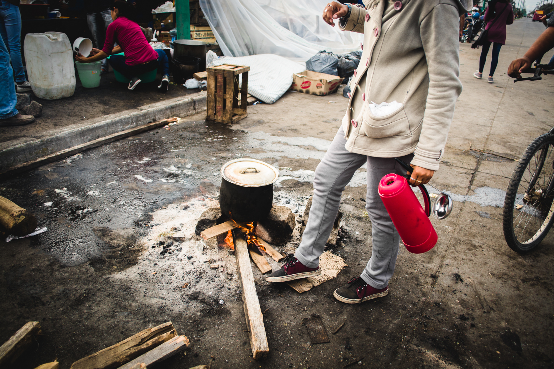 Detrás del cartel hay familias en ronda comiendo un plato de guiso que acaba de salir de una gran olla que una mujer de piel curtida y arrugada revuelve sin cesar. Unas cuantas carpas están apoyadas en el asfalto, con niños durmiendo y madres acomodando y limpiando las pocas cosas que rescataron esa noche de violencia e injusticia. Algunos perros merodean entre niños que juegan al fútbol. Un hombre de tez morena con un overol azul gastado está recostado sobre la vereda, descansando. Tiene las manos negras de mugre, pero allí la poca agua que hay alcanza sólo para beberla. Se llama René, es boliviano y desde 2004 se instaló en Abasto para cosechar verduras en una quinta. “El jueves a las seis de la mañana nos quemaron las chozas que teníamos, nuestras camas, nos sacaron con gases lacrimógenos, a tiros. Quemaron un perro delante de mí. ¿Sabe cómo hicieron? El perrito estaba amarrado, agarraron una frazada, lo taparon, le echaron nafta y lo prendieron fuego. Yo escapé pero me agarraron tres quintas para allá y me dieron un palazo”.