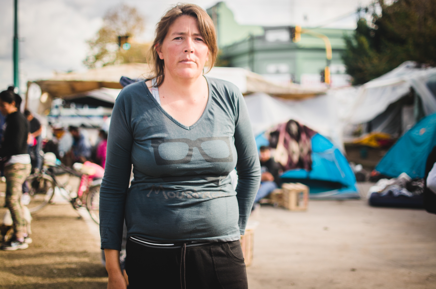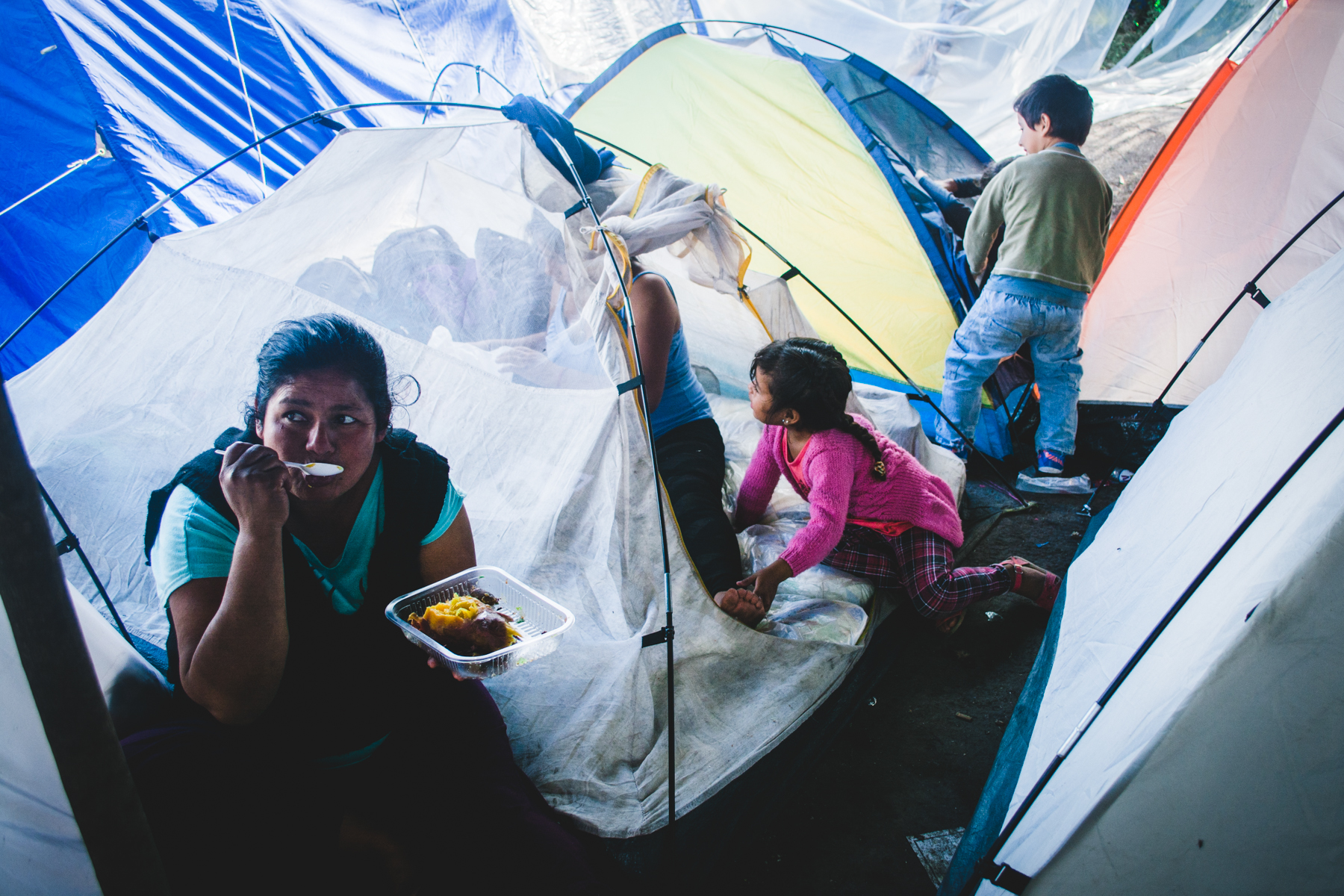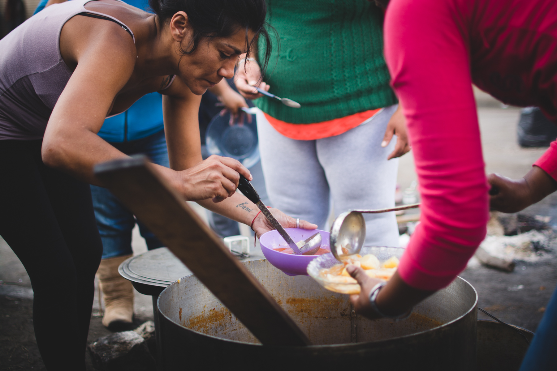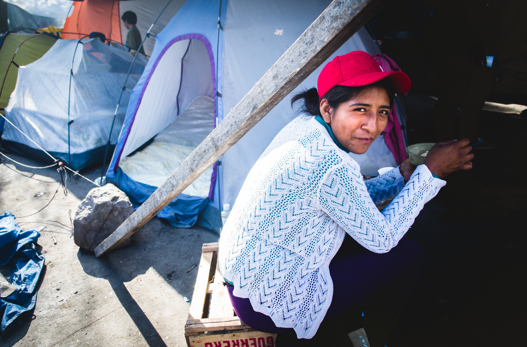 Detrás del cartel hay familias en ronda comiendo un plato de guiso que acaba de salir de una gran olla que una mujer de piel curtida y arrugada revuelve sin cesar. Unas cuantas carpas están apoyadas en el asfalto, con niños durmiendo y madres acomodando y limpiando las pocas cosas que rescataron esa noche de violencia e injusticia. Algunos perros merodean entre niños que juegan al fútbol. Un hombre de tez morena con un overol azul gastado está recostado sobre la vereda, descansando. Tiene las manos negras de mugre, pero allí la poca agua que hay alcanza sólo para beberla. Se llama René, es boliviano y desde 2004 se instaló en Abasto para cosechar verduras en una quinta. “El jueves a las seis de la mañana nos quemaron las chozas que teníamos, nuestras camas, nos sacaron con gases lacrimógenos, a tiros. Quemaron un perro delante de mí. ¿Sabe cómo hicieron? El perrito estaba amarrado, agarraron una frazada, lo taparon, le echaron nafta y lo prendieron fuego. Yo escapé pero me agarraron tres quintas para allá y me dieron un palazo”.